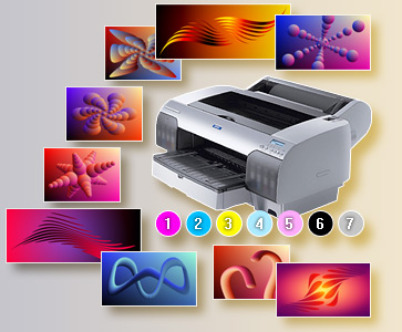 I use an Epson Stylus Pro 4000 printer. This printer, and its larger siblings, is now widely used by many museums and other publishers of fine art reproductions — such as the Boston Museum of Art. Like me, they evaluated many print technologies before settling on the Epson Pro printers. This is simply the best technology available today for long-lasting, high-quality art and photo reproduction. You can find more high-tech printer information at those two weblinks. But in brief this superb printer uses seven different inks, for maximum color range and subtle tones. These inks yield a much greater tonal range, color intensity and detail than is possible with the ordinary four-color offset-based printing used for cheap mass-market posters. I use only the original Epson Archival Quality inks. These are permanent, pigmented inks, and when used with the proper paper the inks are waterproof and smudgeproof.
